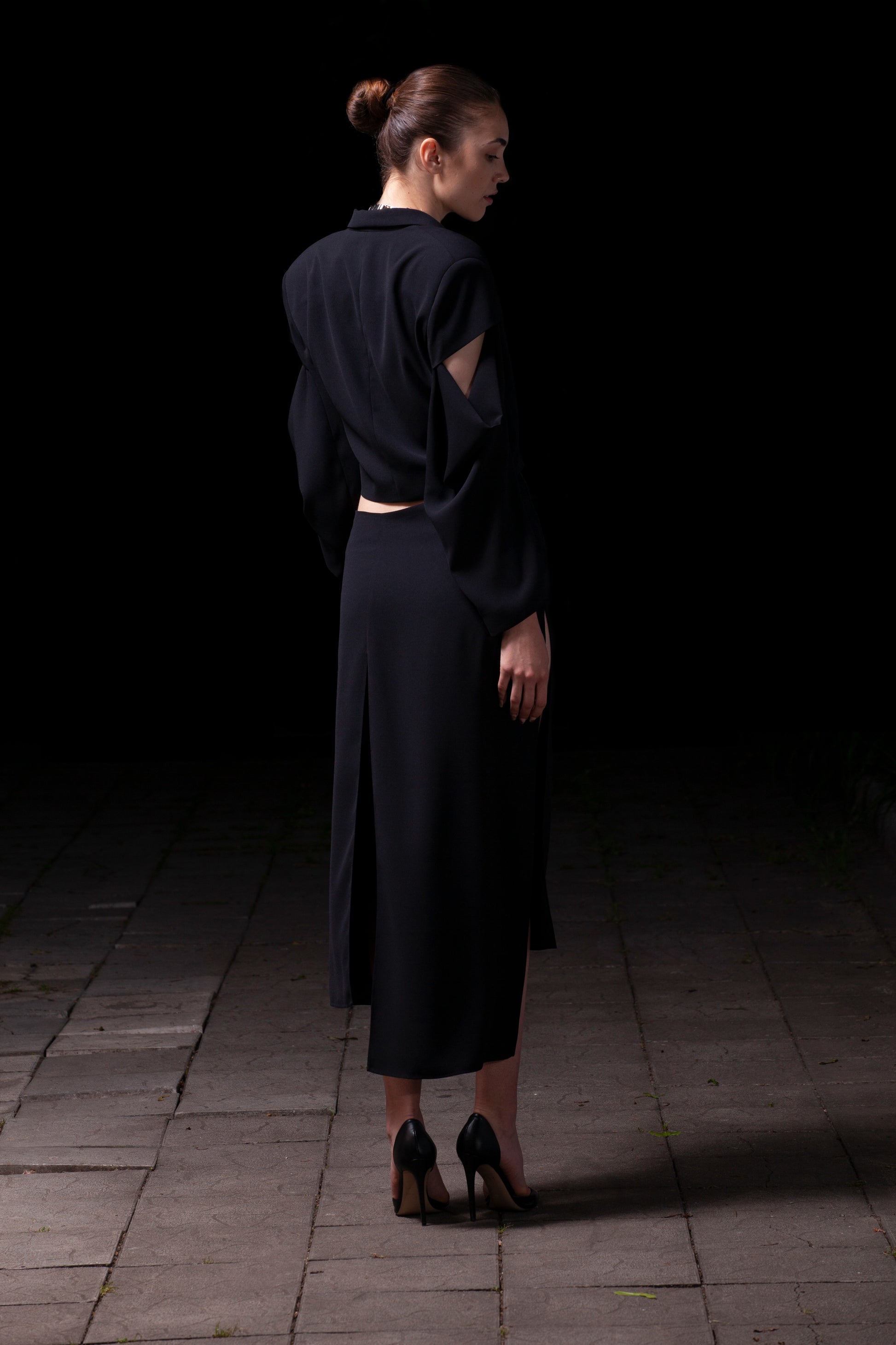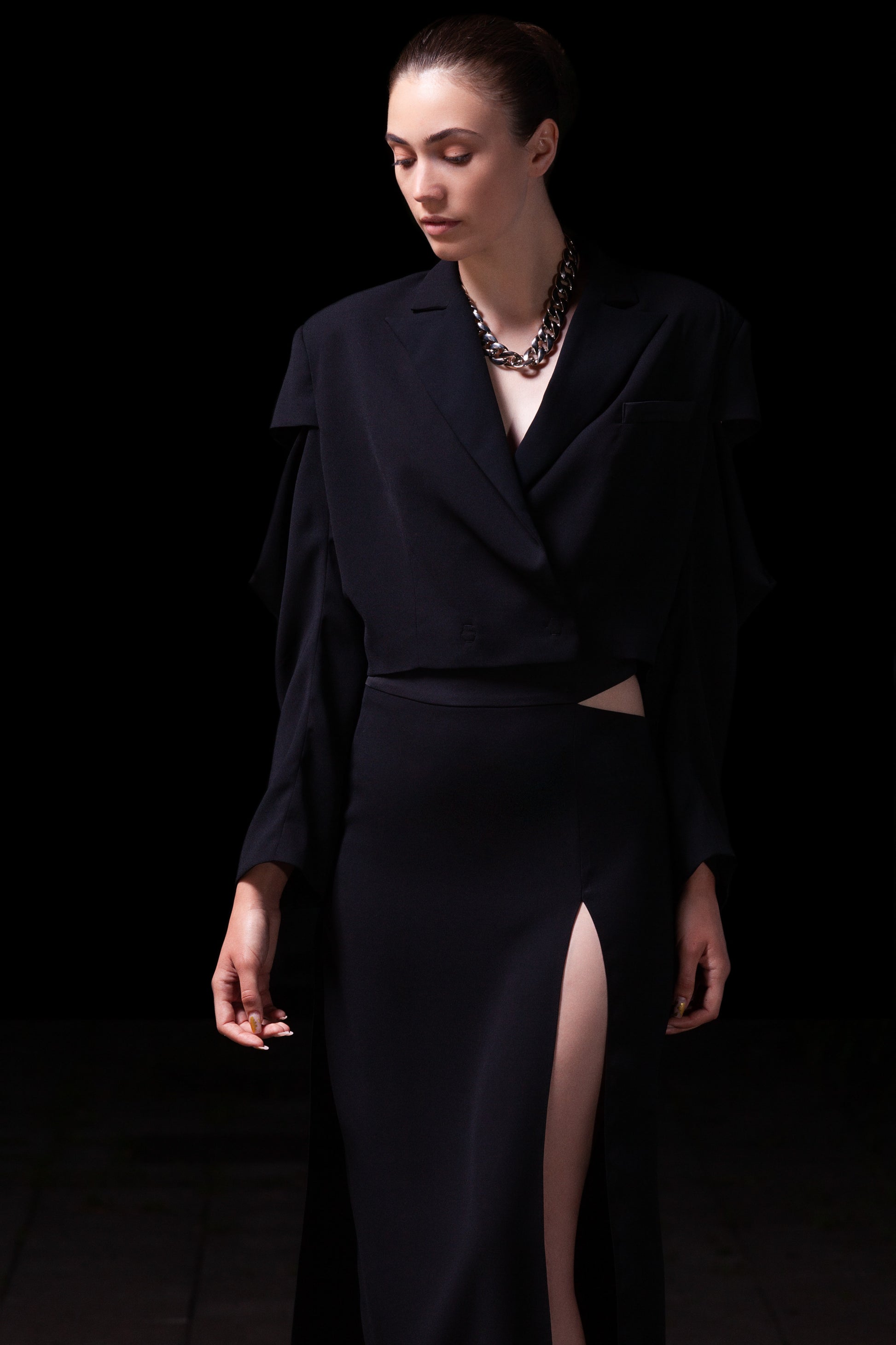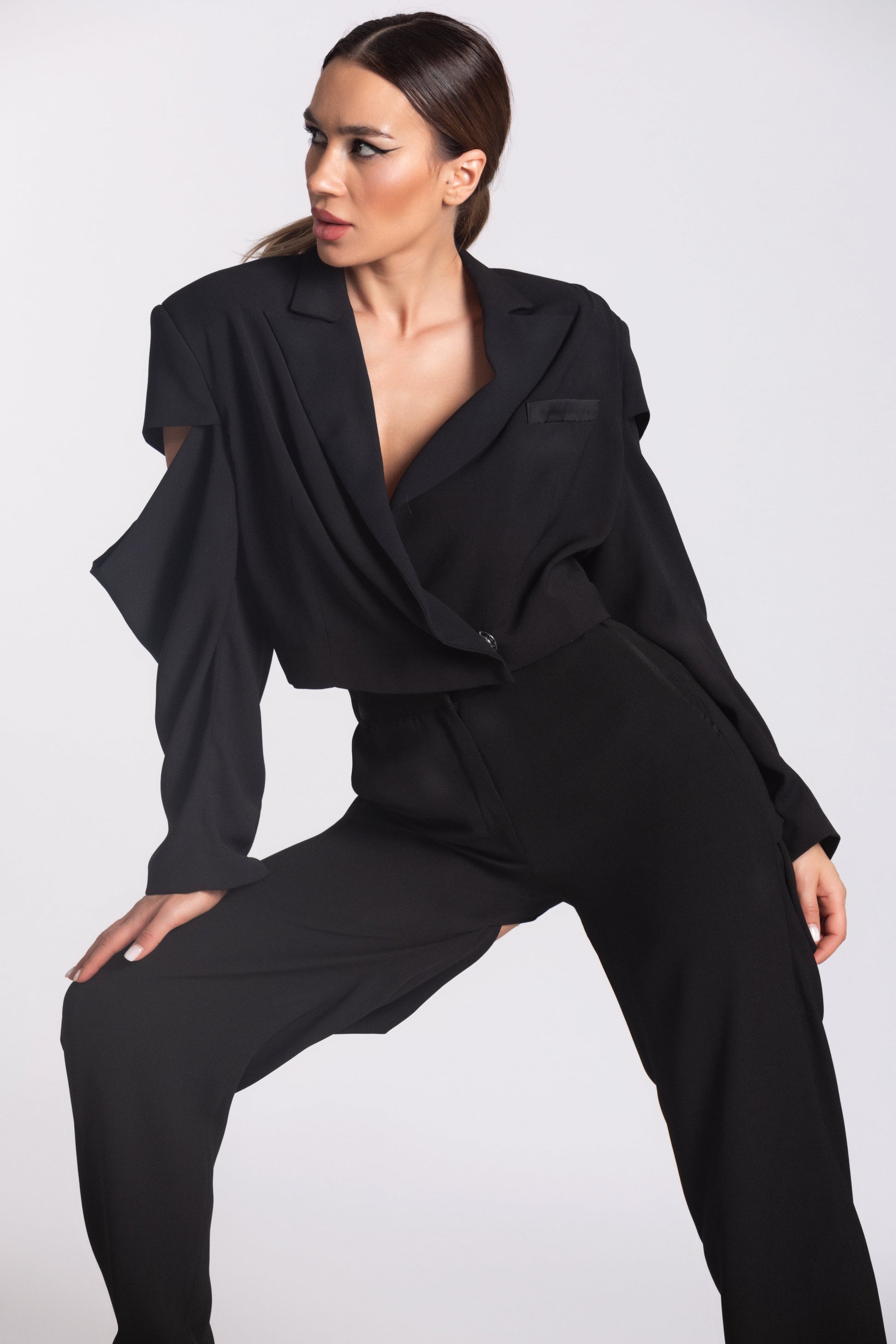 Introducing the Twizzel Blazer, the epitome of refinement and high-end fashion. This luxurious blazer features a double-breasted silhouette, sophisticated bottom sleeves slits, and an exquisite draping open sleeve, all crafted with precision in Romania. Step into elegance with the Twizzel Blazer.